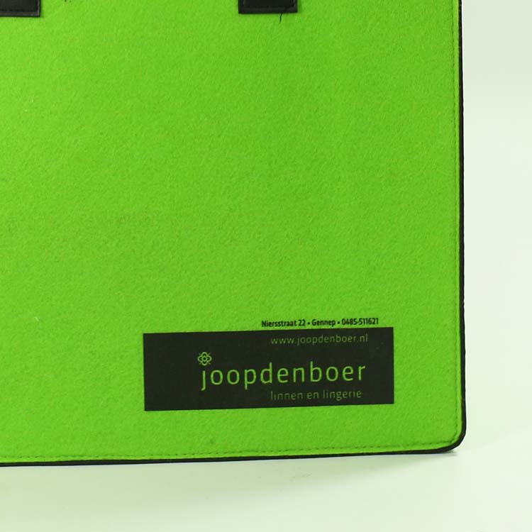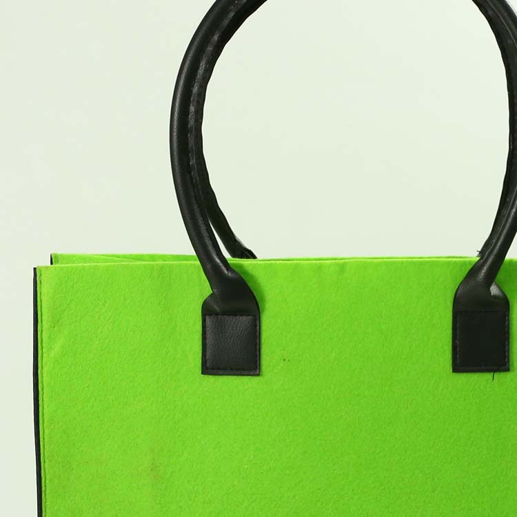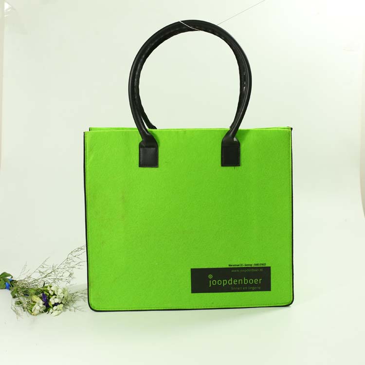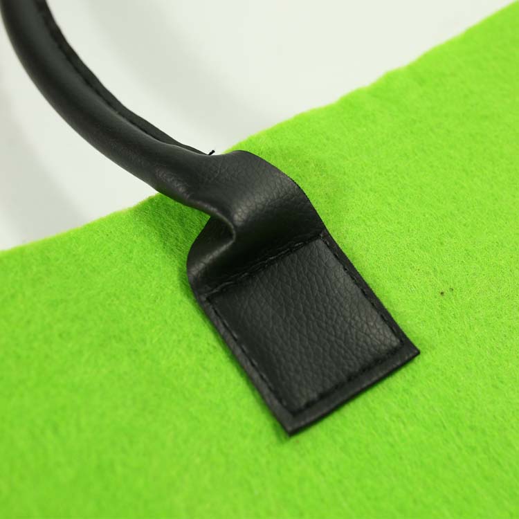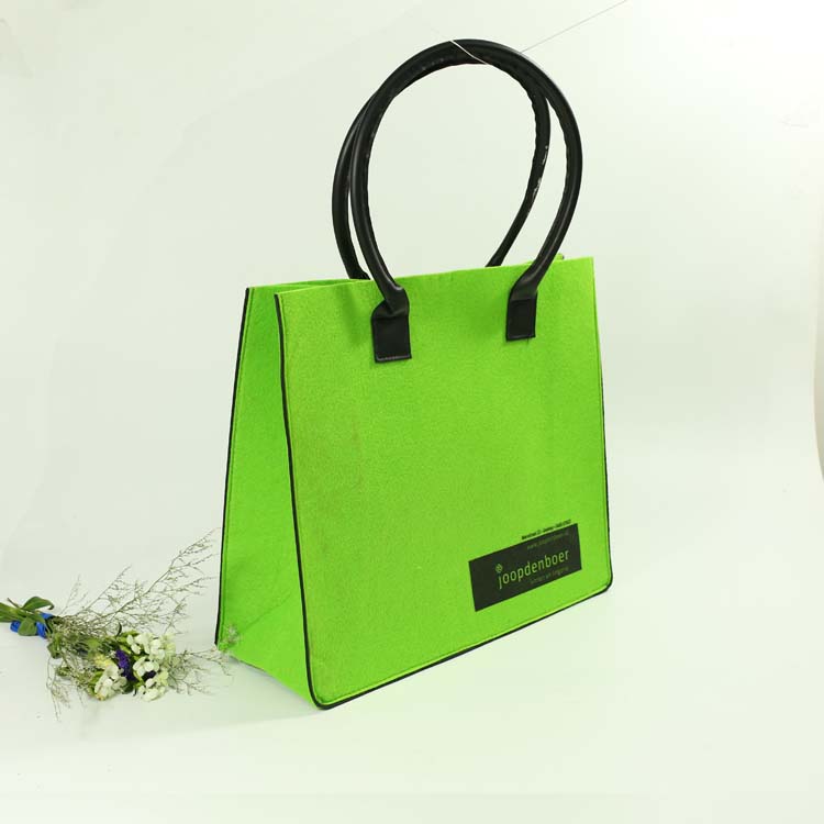Stór stærð kynningar filtpoki. Græna filtefnið með leðurhandfangi passaði mjög vel, gerir filtpokann hágæða. Hvort sem þú ferð að versla eða ekki, þá hentar þessi poki, sérstaklega hentugur til að pakka hágæða vörum.